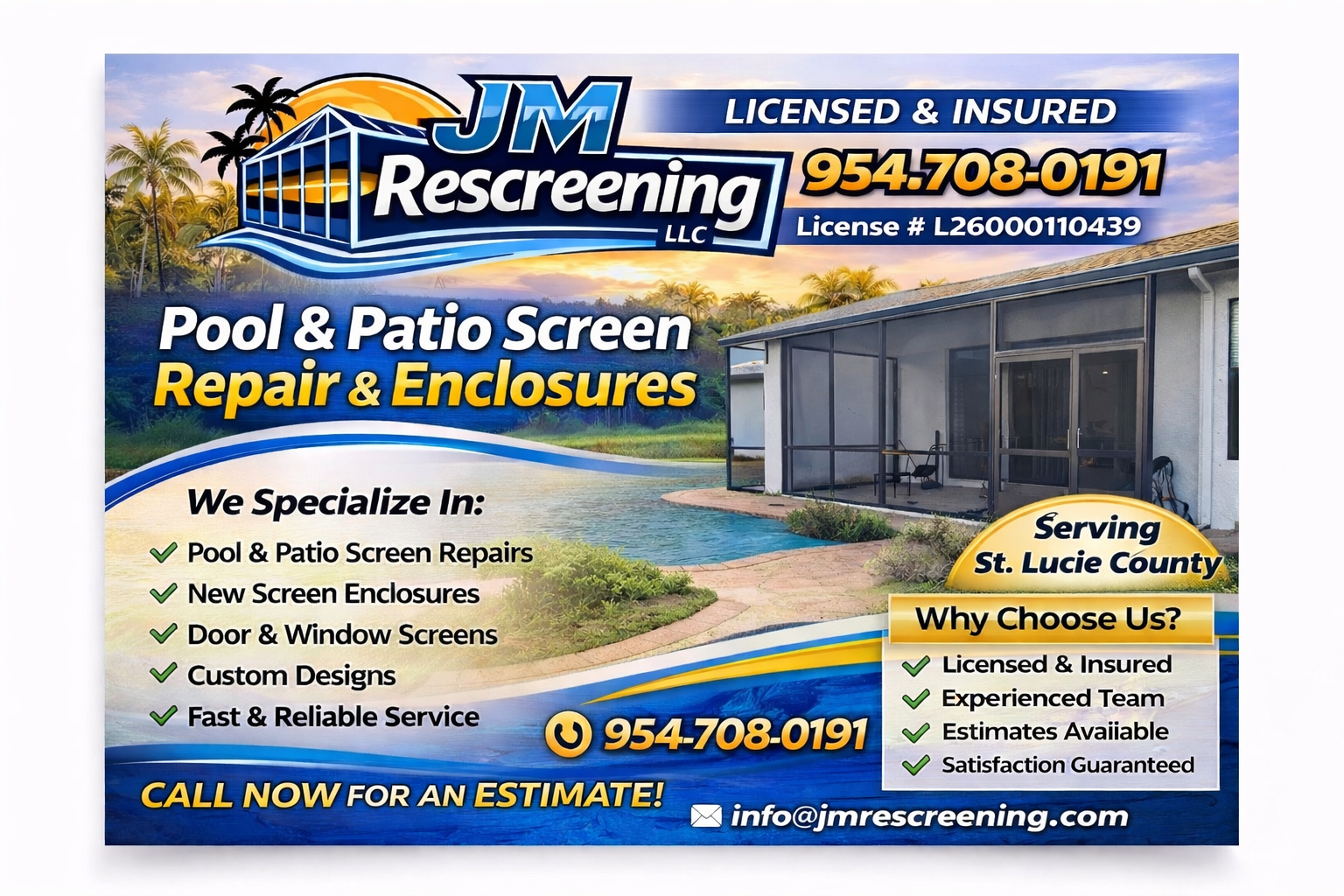 Welcome to JM Rescreening Pool and Patio Screen Enclosure, your trusted partner for high-quality screen solutions in Port Saint Lucie, Florida. As a new business, we're committed to transforming your outdoor spaces into comfortable, pest-free havens. Discover our dedication to superior craftsmanship and exceptional service as we help you enhance your home's beauty and functionality.